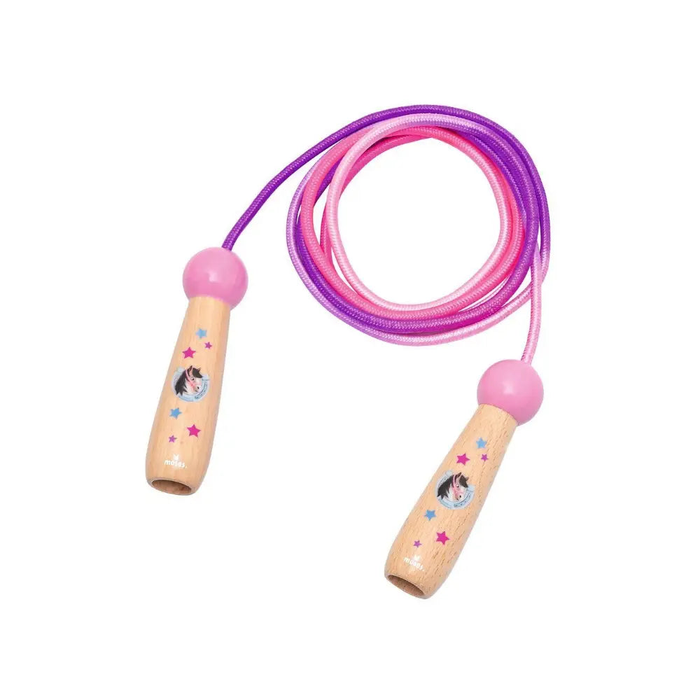Gelukkig is er het Springtouw - Paarden! Dit springtouw combineert de klassieke vreugde van touwtjespringen met een onweerstaanbaar ontwerp. De stevige, gladde handvatten van beukenhout, versierd met lieve paardjes en sterren, liggen perfect in kleine kinderhanden. Het vrolijk gekleurde touw van 2,2 meter maakt van elke sprong een feest. Het is de perfecte manier om spelenderwijs de motoriek, balans en coördinatie te verbeteren.